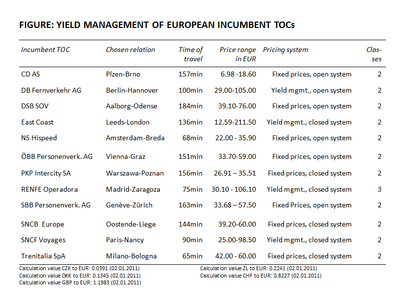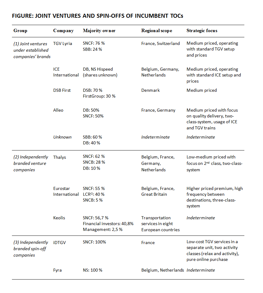 Because of their historic roots, incumbent TOCs possess numerous intangible strategic resources. First, their enormous hub and spoke network with coverage of all important national lines (comparable to full-cost airline’s network) allows them to attract customers for smooth train journeys (KSF 5). Second, especially in the areas of route evaluation (KSF 1) and rolling stock procurement (KSF 2) they tend to have advantages over new challengers. Third, their path dependency offers them close connections to important players in the industry. If long-distance TOCs are still part of a vertically integrated conglomerate, they can access know-how from nearly all value system activities as well as influence decisions of important value system players. Moreover, flexible reactions in cases of disruptions (e.g. delays in schedule) and problem solving capabilities are on the incumbent side.
