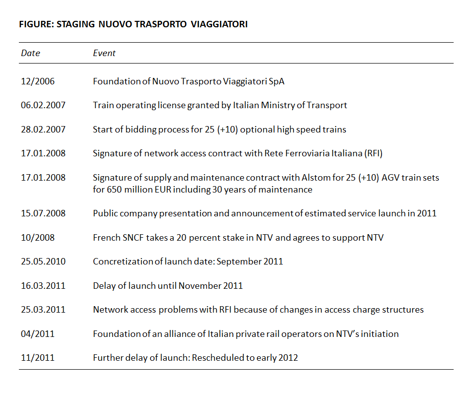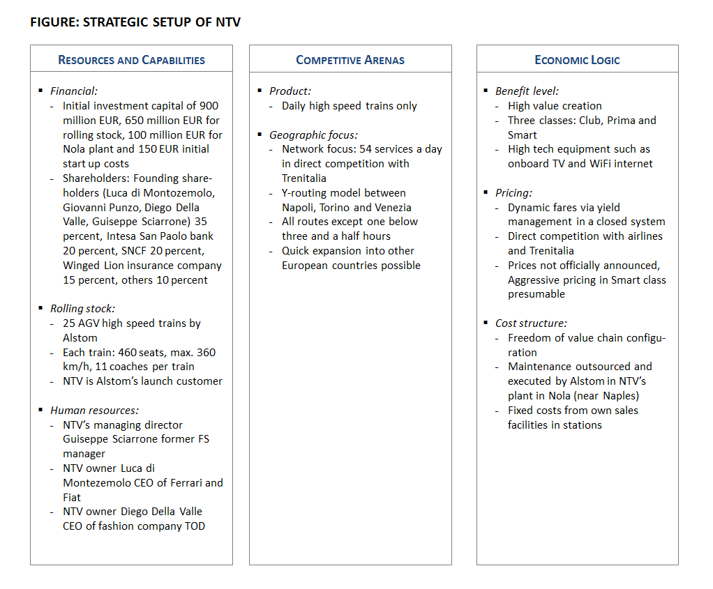 In its company establishment NTV focused on partnering to internalize crucial resources and capabilities for its market entry. The company accessed rolling stock from the OEM Alstom that produces as well as maintains NTV’s fleet. Moreover, the French incumbent SNCF provides NTV with industry knowledge and offers financial support as a major shareholder (SNCF’s major challenger DB was dismissed in the partner selection process by NTV.) (Railway Gazette, 2008b, p. 1; Railway Gazette, 2008g, p. 1). NTV and SNCF agreed that the French incumbent will not compete with NTV in the Italian market (Briginshaw, 2010b, p. 30).