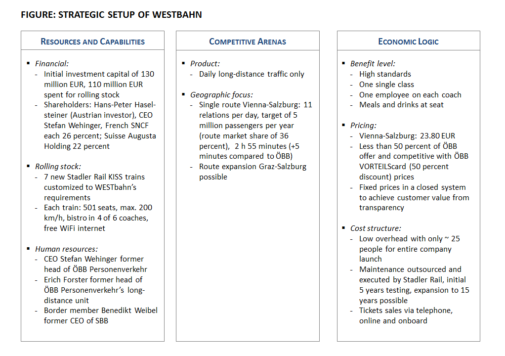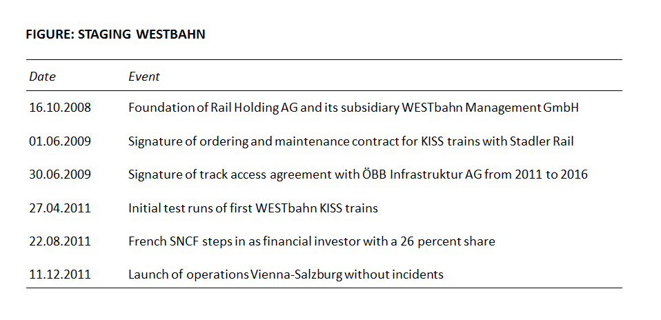 tered services on December 11, 2011 by offering regular hourly scheduled services between Vienna and Salzburg. WESTbahn possesses sufficient financial backup as well as strong partnership ties with the leading rail industry players Stadler and SNCF. The company offers low prices with adequate benefit levels to outcompete ÖBB Personenverkehr. Its lean cost structure provides the necessary competitive edge.