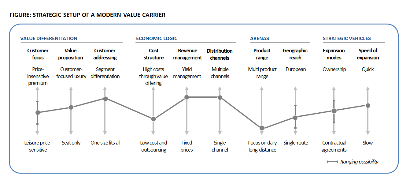 Modern value carriers focus on efficient point-to-point transportation by addressing a broad customer base. They are to a certain extent copying the value creation of network-carriers with the major differentiation of lower prices. Their strategic orientation is presented in the following section.