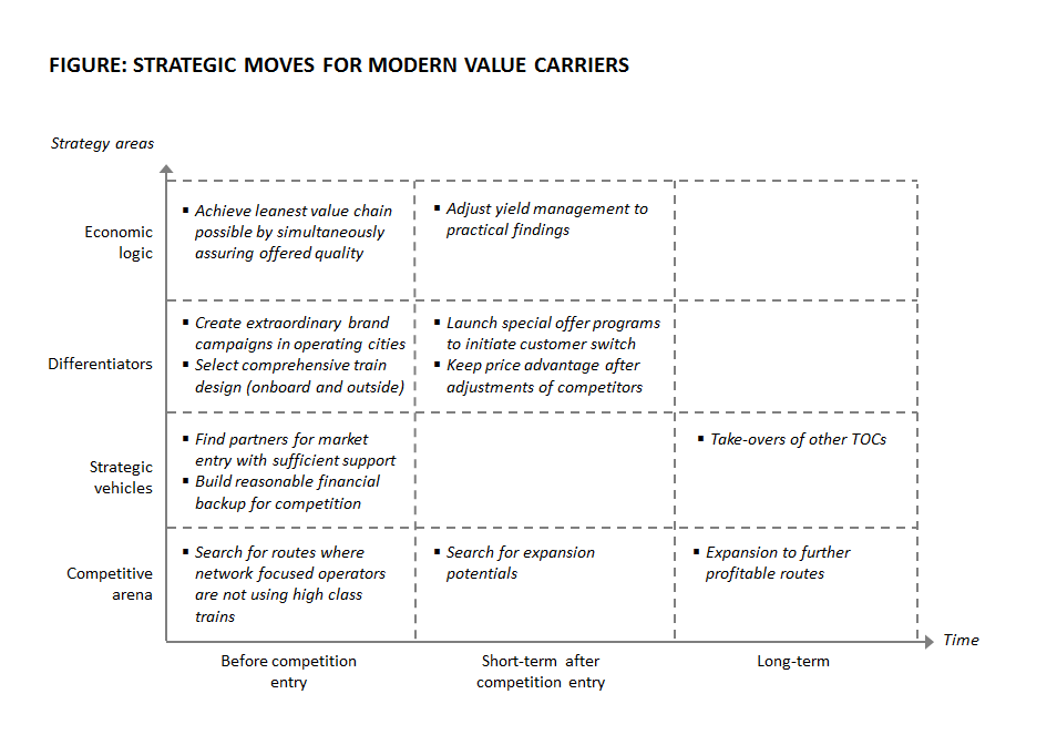 Strategic moves of modern value carriers focus on sustaining competitive differentiators towards network-focused operators, which is cost competitiveness to offer lower prices with a certain customer value. Therefore, a lean value chain is crucial for competition. Second, creating a high value brand needs to be achieved before market entry. Modern value carriers should focus on routes where network-focused operators are not operating with their latest, modern train sets. By that, a competitive edge for modern value carriers can be created and customer can be easily motivated to change providers.