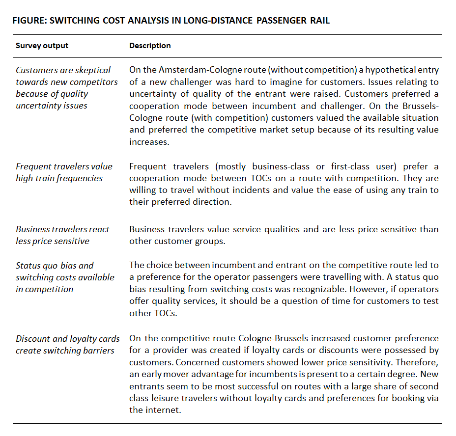 In 2011 Paha et al. analyzed switching costs in the field of long-distance passenger rail transport for the first time. The researchers collected almost 700 data sets of customers on-board trains. They selected the two routes Cologne-Brussels with on-track competition between Deutsche Bahn and Thalys and Cologne-Amsterdam in single operation of Deutsche Bahn. The study’s major findings are summarized in the gallery.