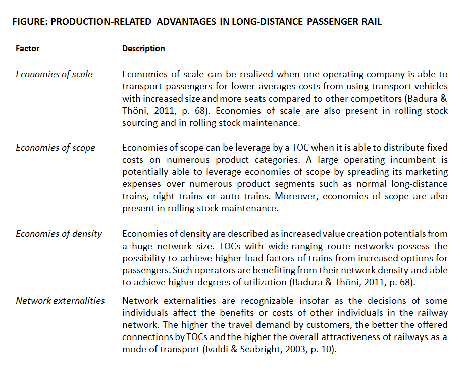 In railway transportation an initial entry barrier arises from the limited availability of railway network and station slots. Most attractive network slots are often already served by incumbents and only a small amount of slots is accessible for new entrants in most countries. Therefore, fair distribution of limited infrastructure capacity is essential. Second, an entry into the TOC business involves a high degree of capital requirements for the initial investment in rolling stock. The procurement process of new rolling stock lasts between two and five years depending on the product choice and on available capacities of rolling stock OEMs. For a train operating company this seems to be an unsatisfying long time frame. However, markets for second-hand rolling stock hardly exist.